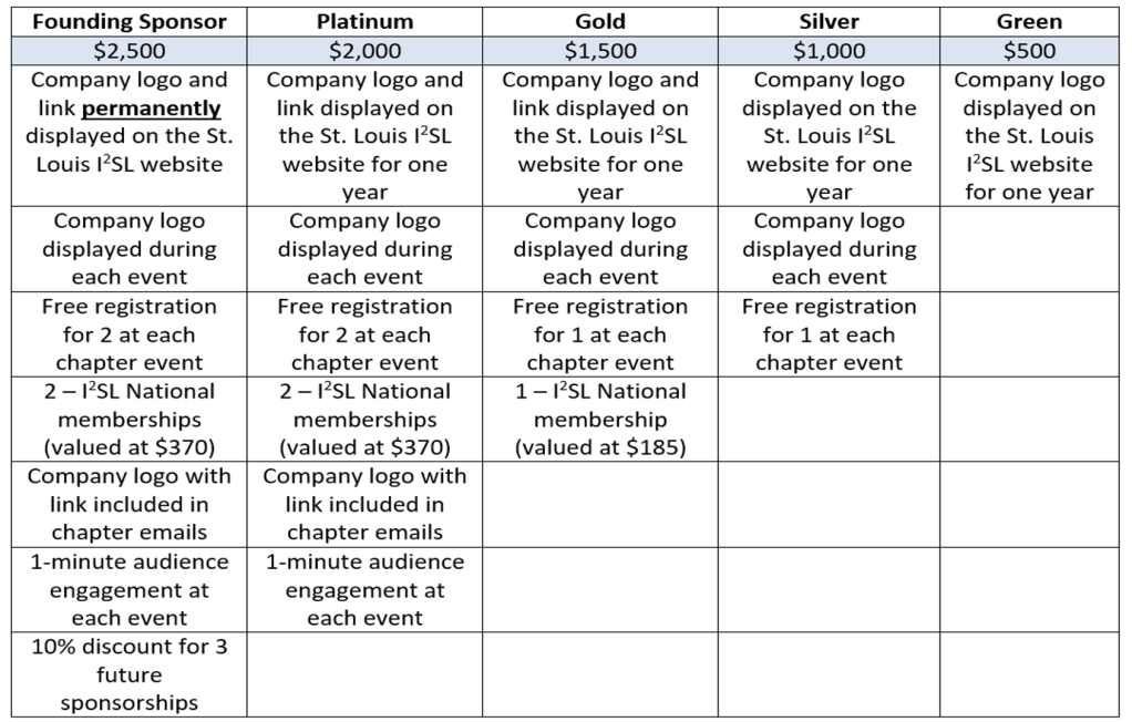 Are you interested in helping to establish the I2SL St. Louis Chapter? If so, become one of our founding sponsors!